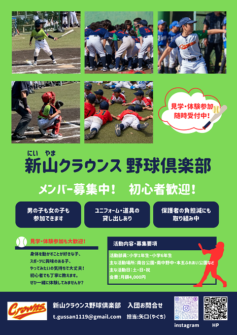 新山クラウンス野球倶楽部では、一緒に野球を楽しんでくれる小学生を待っています。主に低学年の選手が練習を行っている南台公園(中野区南台5丁目7号) にて随時、体験練習をお受けいたします。